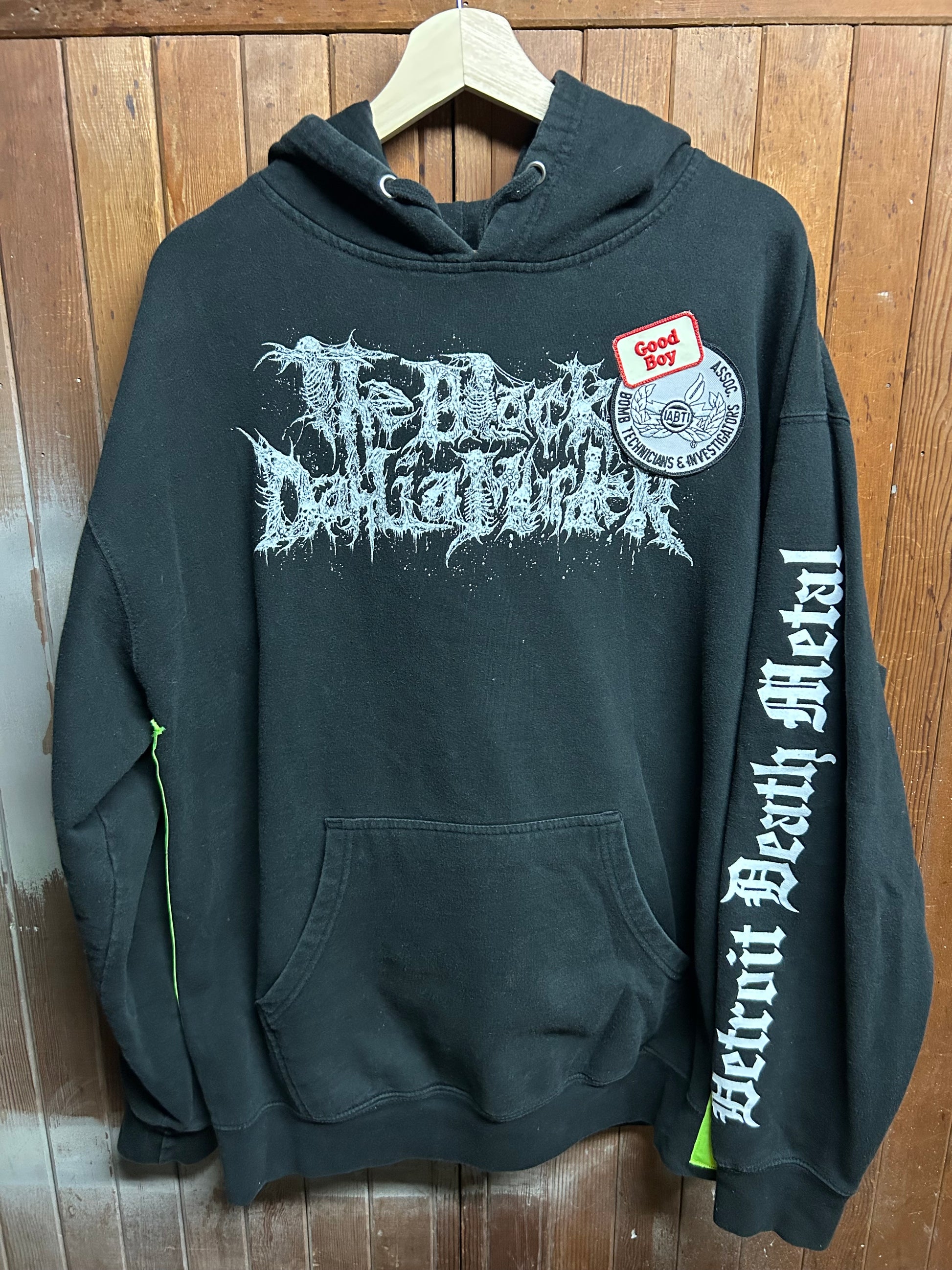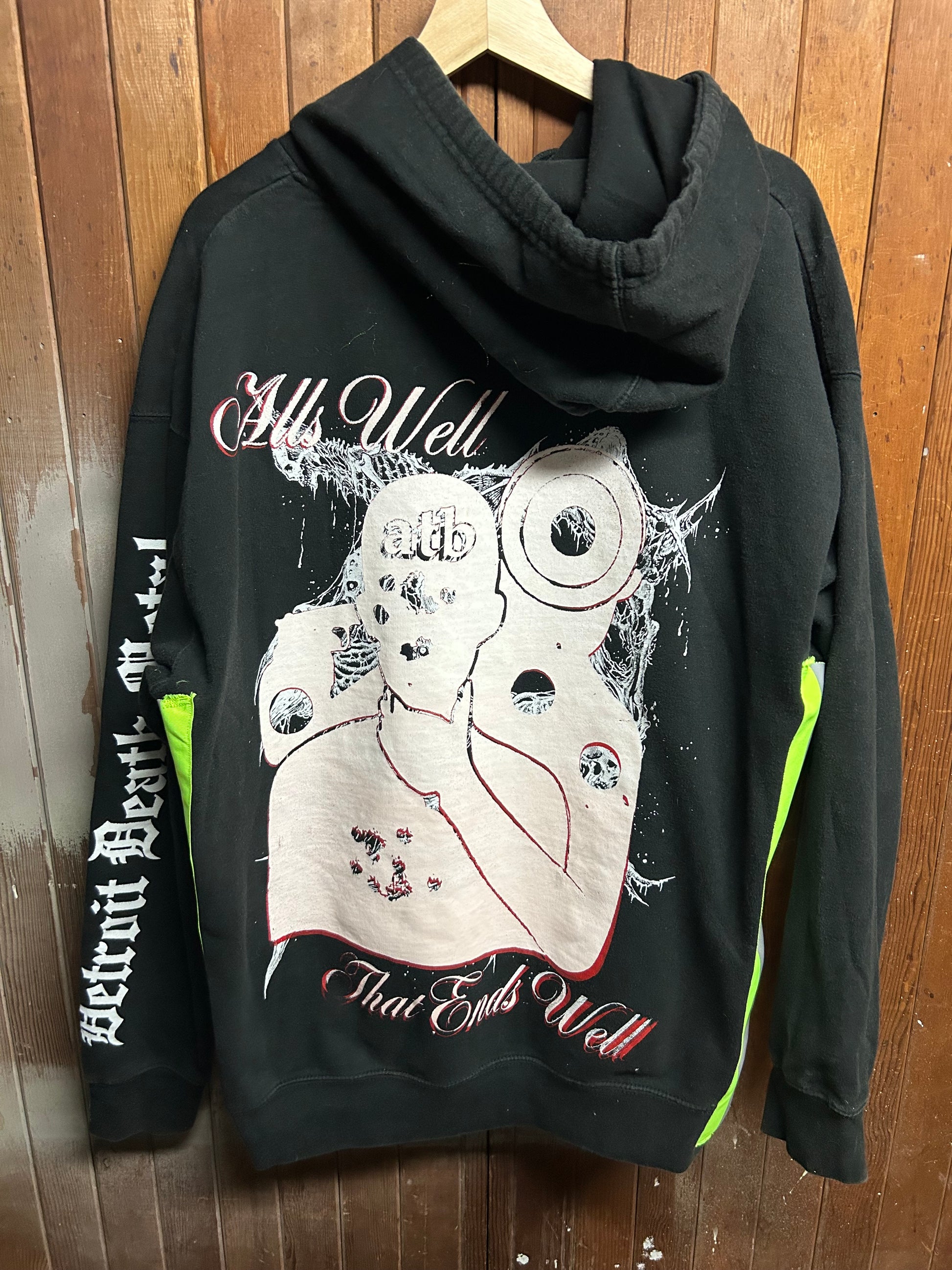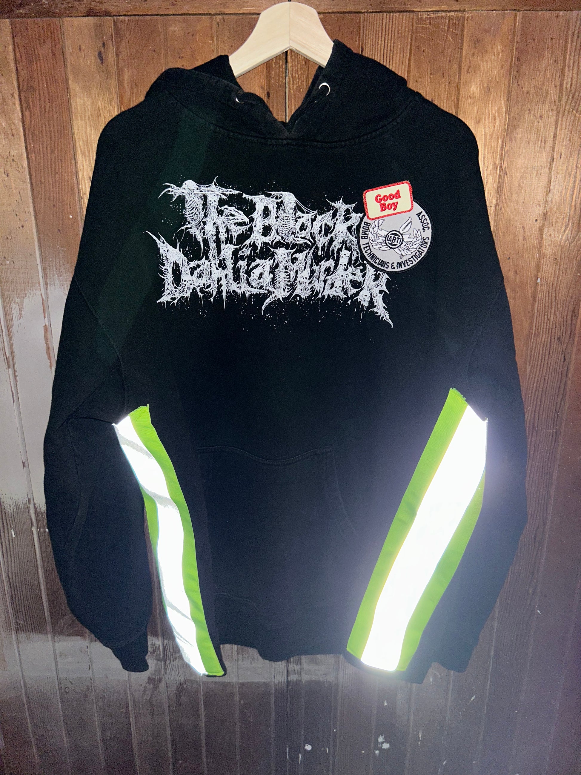 Hand screenprinted graphics with water based ink, hi vis strip sewn into the sides and self embroidered and vintage patches sewn in. Sewn in handmade in hell woven tag.