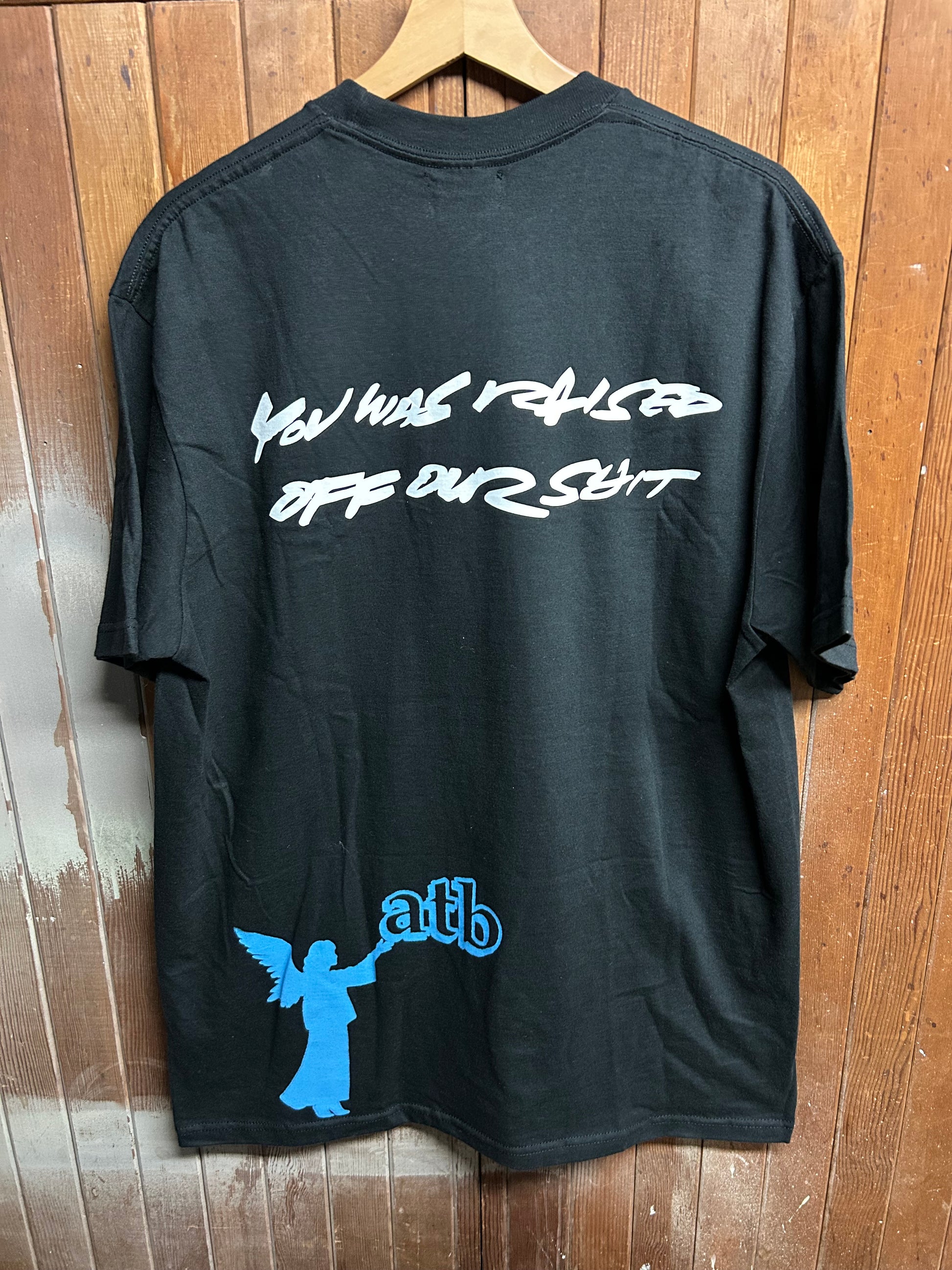 Self embroidered design and hand screenprinted graphics with water based ink. Sewn in handmade in hell woven tag.