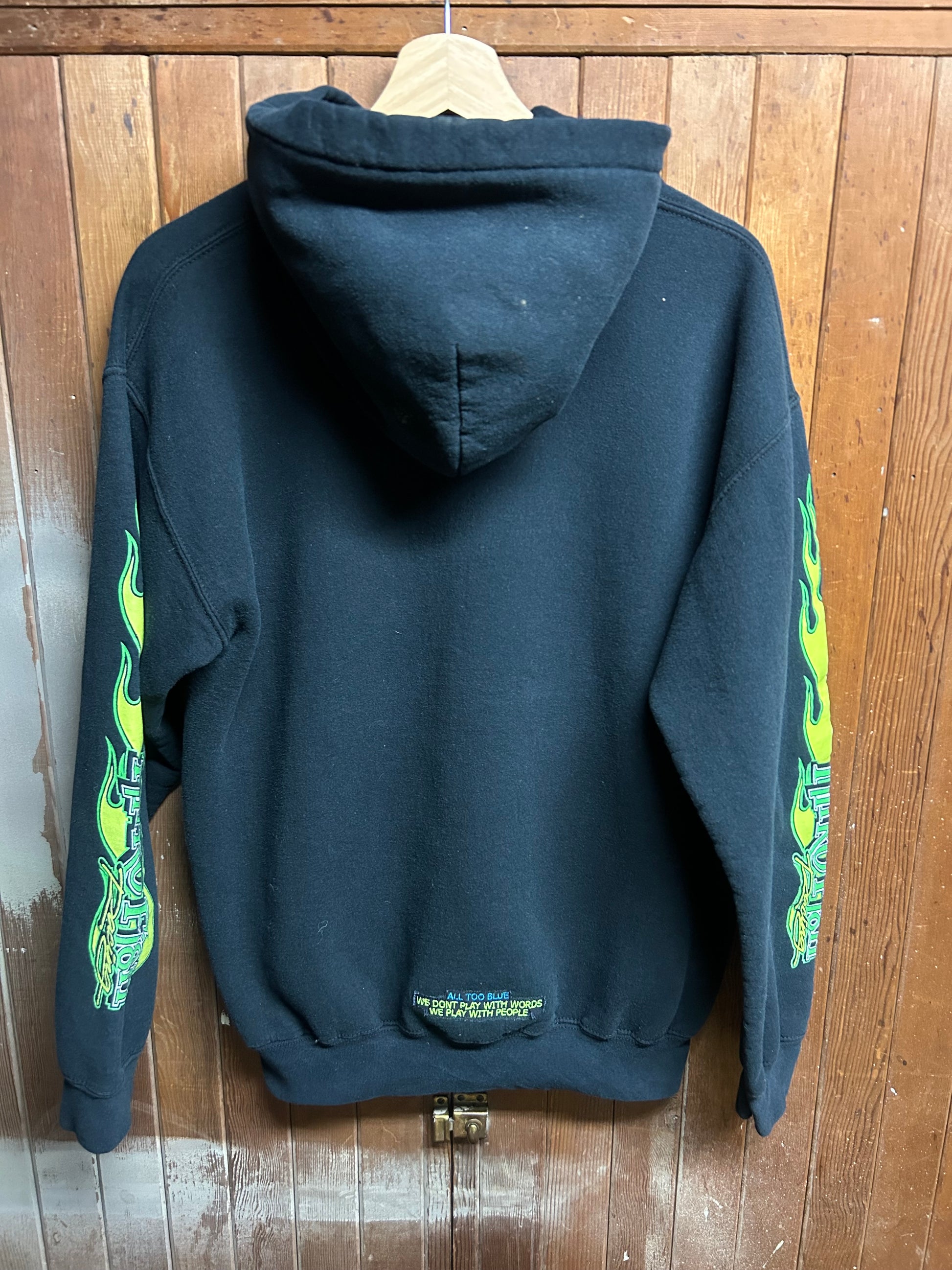 Self embroidered design and hand screenprinted graphics with water based ink. Sewn in handmade in hell woven tag.