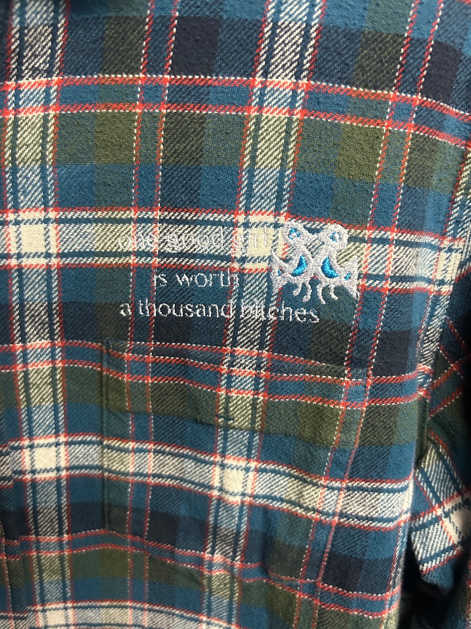 Self embroidered design and hand screenprinted graphics with water based ink. Sewn in handmade in hell woven tag.