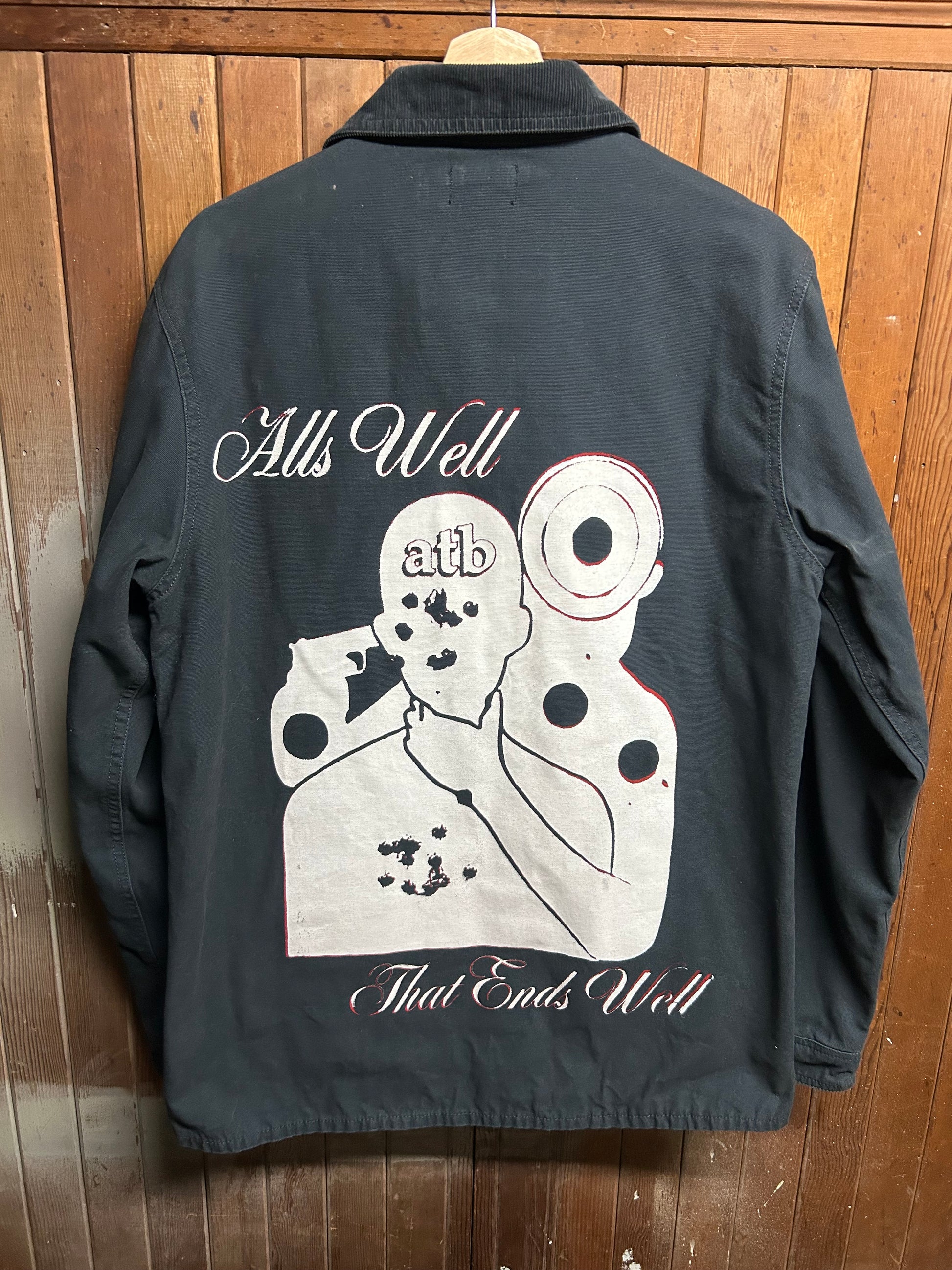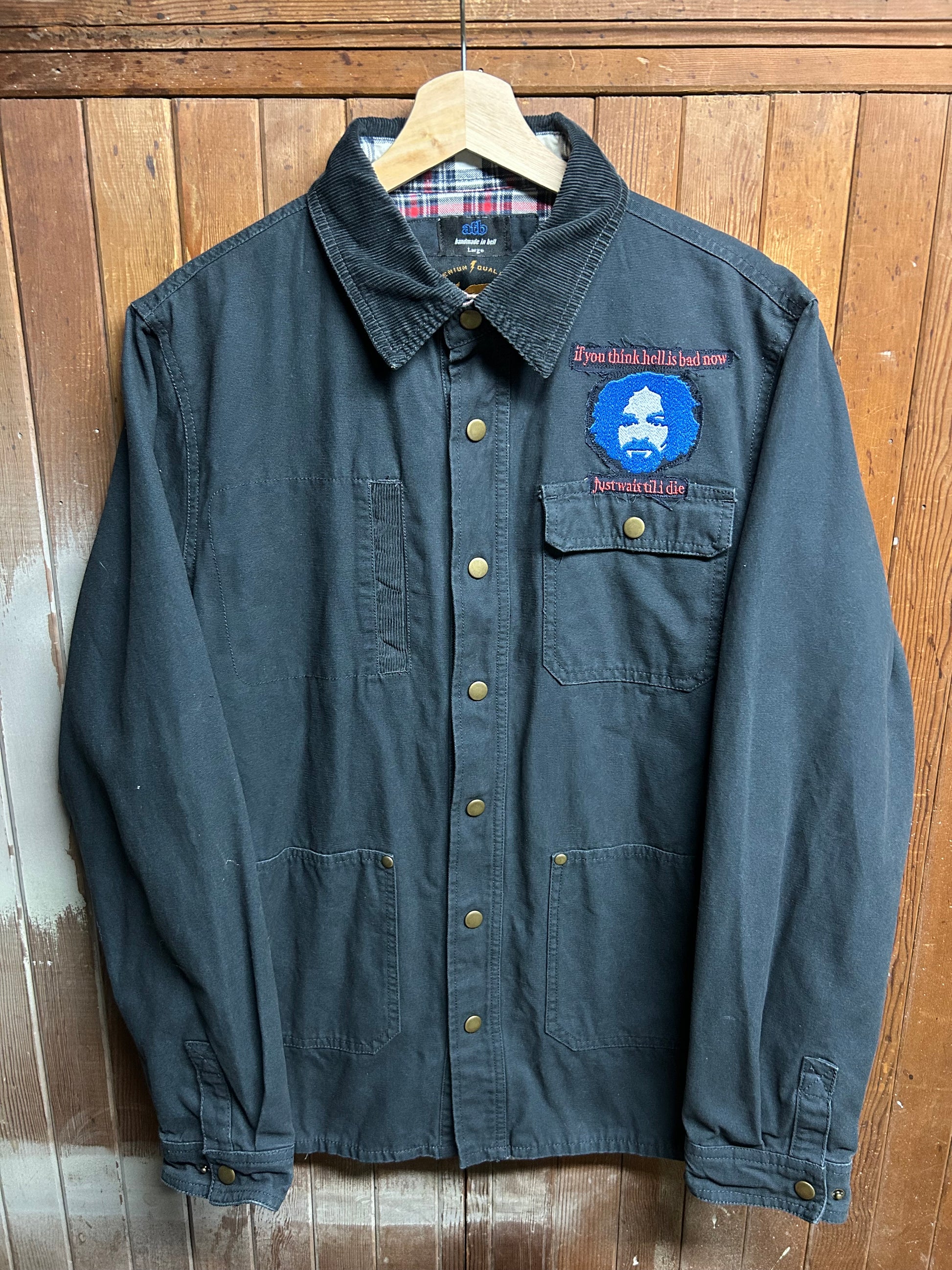 Self embroidered design and hand screenprinted graphics with water based ink. Sewn in handmade in hell woven tag.